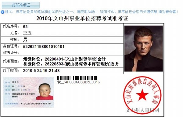 ∷準考證請使用A4紙縱向打印,準考證必須在報名系統中直接打印,不能下載網頁到本地下載。打印的準考證中必須有個人頭像、條形碼、身份證照片及文山州人社局公章。