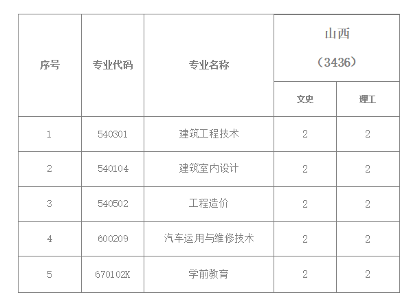 云南城市建設職業學院2018年高職(專科)山西分專業計劃表 填報志愿代碼3436