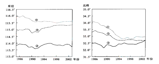 產(chǎn)業(yè)重心是區(qū)域產(chǎn)業(yè)產(chǎn)值空間分布的重心。下圖所示為中國(guó)三次產(chǎn)業(yè)重心的經(jīng)、緯度變化(不含臺(tái)灣、香港、澳門(mén)的統(tǒng)計(jì)資料)。完成21~23題。