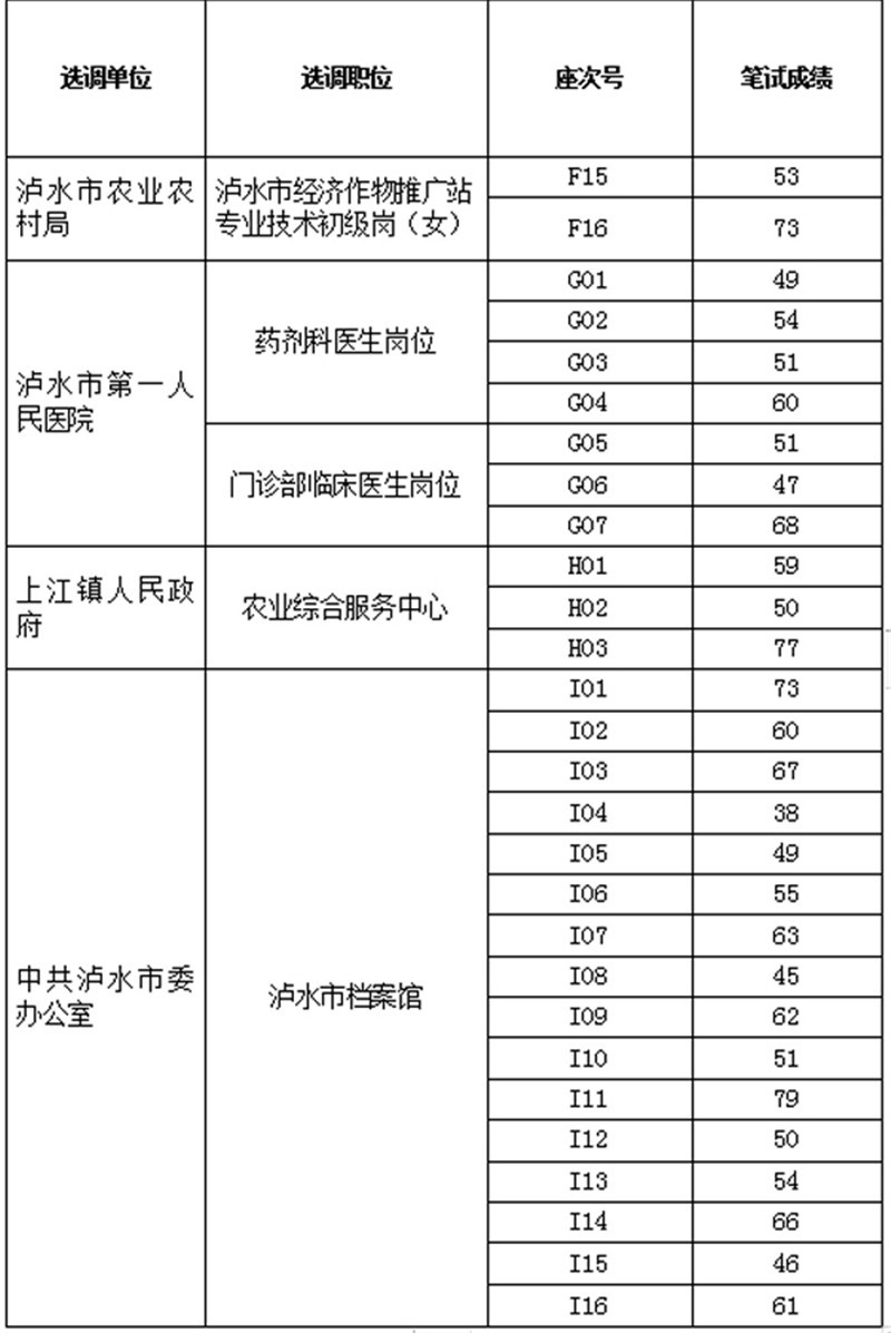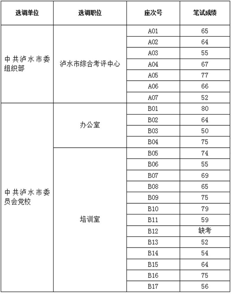 根據《瀘水市機關事業單位工作人員調配暫行規定(試行)》《瀘水市2019年機關事業單位公開選調工作人員公告》等有關規定,現將瀘水市2019年機關事業單位公開選調工作人員筆試成績公示如下。