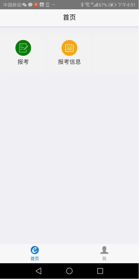 (二)進入平臺后,界面下方顯示“首頁”和“我”兩個選項,“首頁”選項顯示“報考”和“報考信息”兩個按鈕,“我”選項顯示考生基本信息和“注銷”功能。如下圖所示: