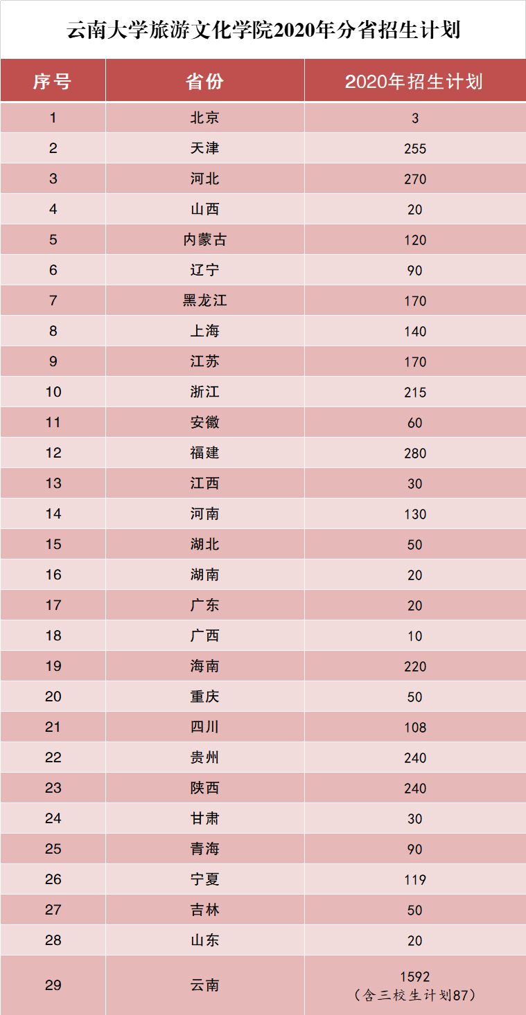 云南大學旅游文化學院2020年分省分專業招生計劃(點擊在線瀏覽)